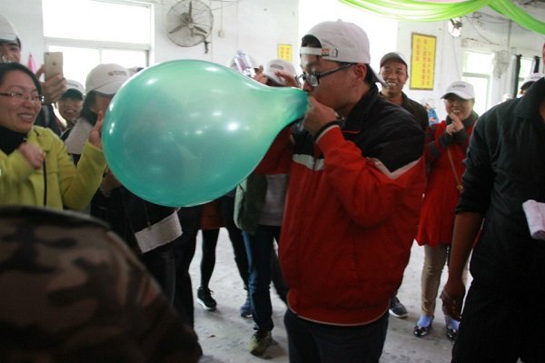 吃過(guò)午飯后,經(jīng)過(guò)一個(gè)小時(shí)的休息,拓展活動(dòng)繼續(xù)進(jìn)行。下午的第一個(gè)活動(dòng)為“牛皮吹破天”,要求各小組將所發(fā)全部氣球吹爆,總計(jì)時(shí)間最短的小組獲勝。裁判根據(jù)氣球頭數(shù)量核實(shí)戰(zhàn)績(jī)。游戲開(kāi)始時(shí),各小組的男士們紛紛發(fā)揮紳士風(fēng)度,爭(zhēng)分奪秒,氣球爆炸聲此起彼伏,為了加強(qiáng)娛樂(lè)性,裁判組分別給每個(gè)小組分發(fā)一個(gè)大氣球,每次大氣球的吹爆過(guò)程都能引來(lái)隊(duì)員們的側(cè)目相看,隊(duì)員們臉上露出各異的表情,或驚奇,或興奮,或賊笑……